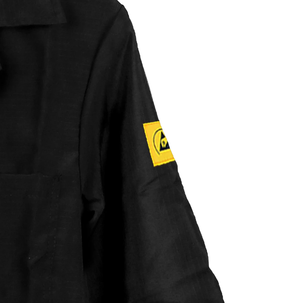 This extra-small black ESD lab coat is made from a lightweight, static-dissipative fabric, providing reliable protection in electrostatically protected areas (EPAs). Designed for comfort and practicality, it includes a breast pocket, side pockets, and studded cuffs for a secure fit. The ESD symbol on the left sleeve ensures easy compliance identification.