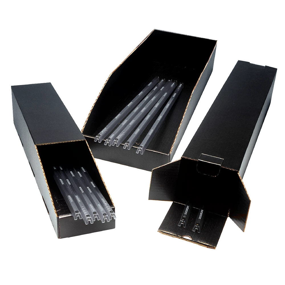 Provides effective in-plant ESD protection for components, including dip tubes and ICs. The fully open version offers basic protection, while the open-front version is stackable for efficient storage. The closed version provides Faraday protection during shipping and dissipates static charges in storage. With an exterior resistance of less than 10⁵ ohms/sq, these boxes are supplied flat-packed for easy storage and offer a long shelf life of up to 10 years.