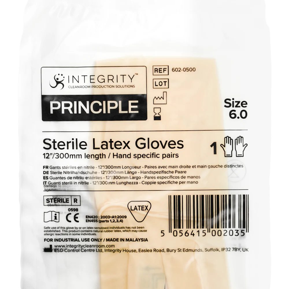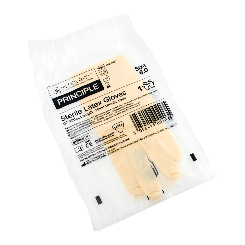 PRINCIPLE sterile latex gloves are hand-specific and designed with a longer-length beaded cuff (12in / 305mm) for extra protection. These Class 100 / ISO 5+, powder-free gloves have a textured palm surface for enhanced grip, making them ideal for handling delicate or contamination-sensitive items. They are natural in colour, sterilised by a minimum of 2.5 Mrad gamma radiation, and supplied double bagged for added protection.