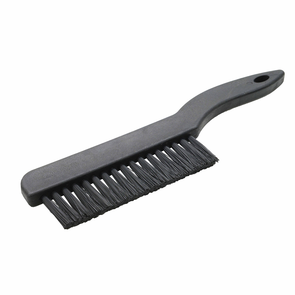 The ESD single row brush (S007) is made from conductive plastic with low static generating synthetic fibre bristles. It is designed to remove dust, dirt, and debris from printed circuit boards (PCBs) and other static sensitive components while minimising static build-up. When held by grounded personnel, the brush dissipates electrostatic charges safely to ground.