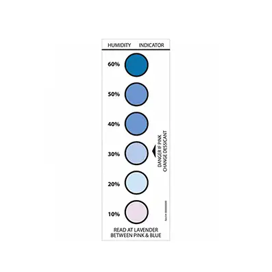 These humidity indicator cards (HICs) provide a straightforward, reliable way to monitor moisture levels in vacuum-sealed or moisture-barrier packaging. Manufactured from high-grade blotting paper, each card (which measure approx. 40mm x 120mm) contains humidity-sensitive spots that change colour from blue to pink as humidity increases, providing an immediate visual reference of internal conditions.