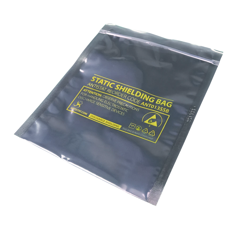 These resealable static shielding bags (ANT013SSB) feature a grip seal closure, providing a secure and reusable packaging solution for sensitive electronics. Designed to reduce the risk of electrostatic damage during handling, shipping, or storage, the multi-layer construction forms a reliable Faraday cage around your components.