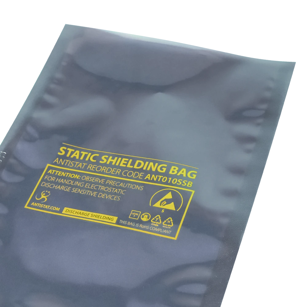 The ANT010SSB shielding bag is designed for storing or transporting static-sensitive devices in electrostatically protected areas, with an open-top design that allows for the easy insertion and removal of components such as PCBs, ICs, and computer hardware, while maintaining strong electrostatic discharge (ESD) protection.