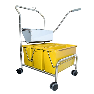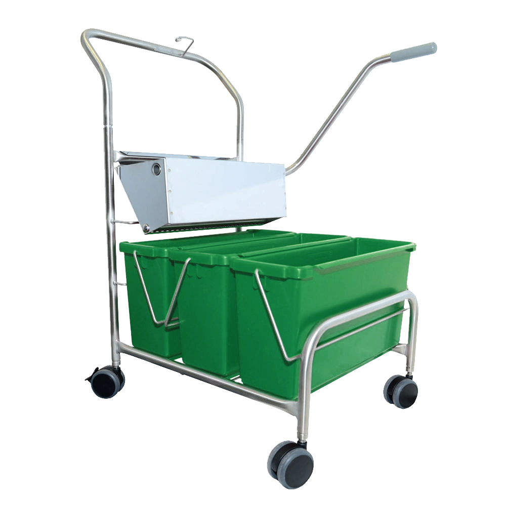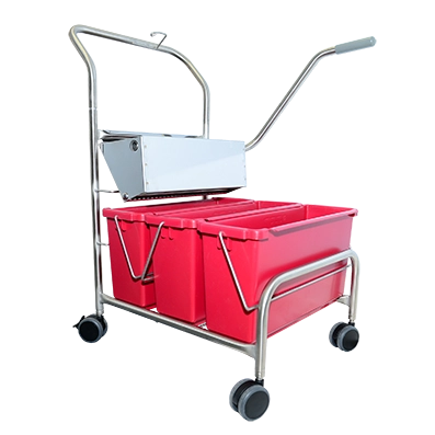 Stainless steel cart with three 15L colour-coded buckets