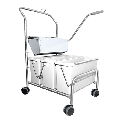 The Integrity triple bucket mopping system features a durable, lightweight stainless steel cart and three 15L high-temperature resistant polypropylene buckets. The cart is fitted with four 3in casters, including one lockable caster that can be engaged with a simple foot action for secure positioning.